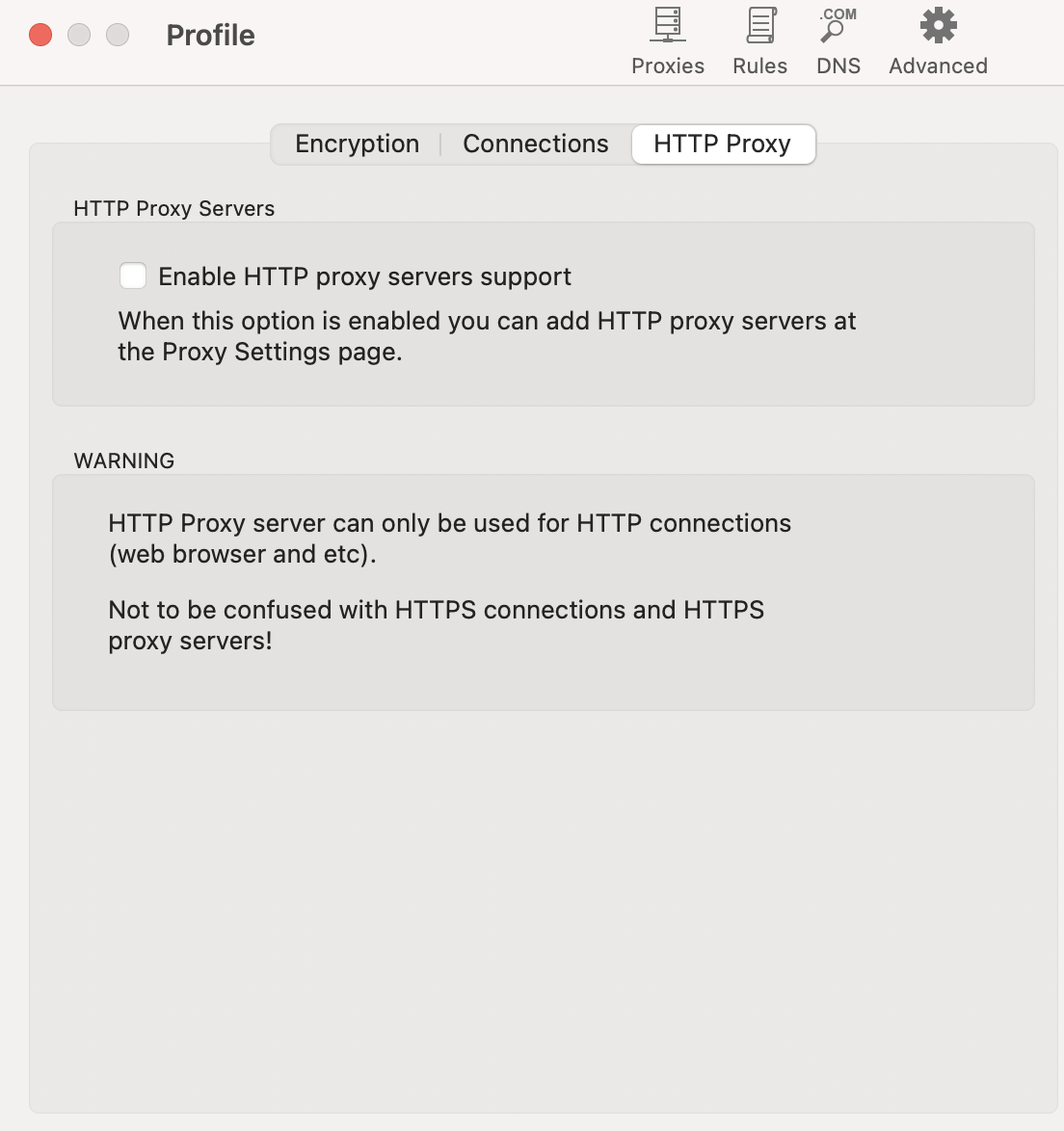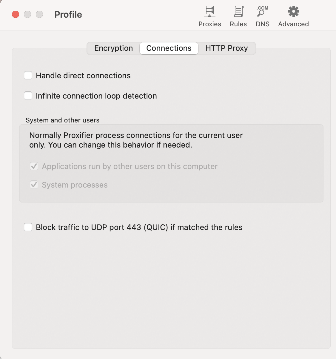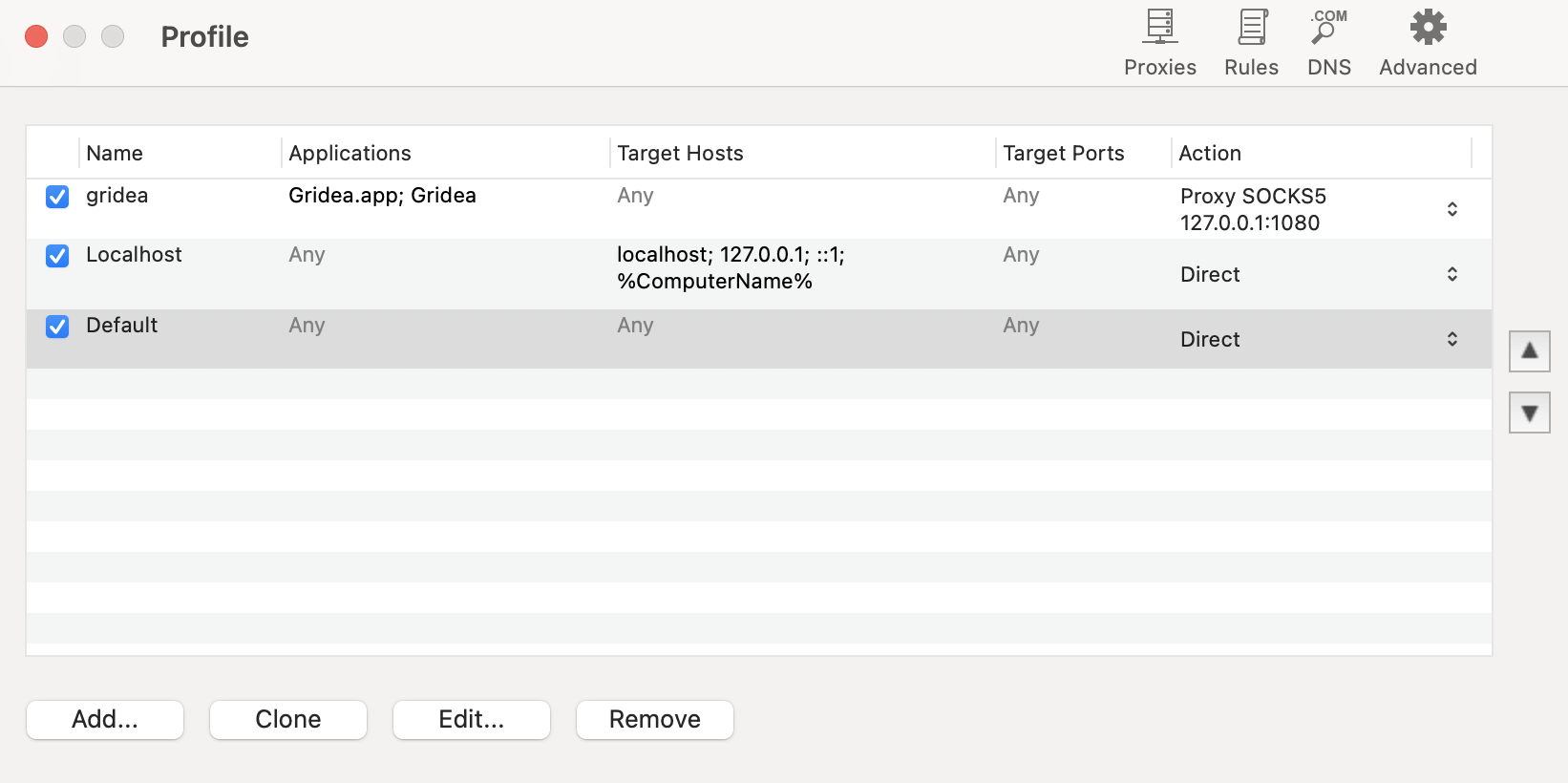 Here I modified the default rule’s proxy mode to direct connection, after all we are only using this software to proxy GrideaAPP. The circumvention functionality should be left to our dedicated tool.