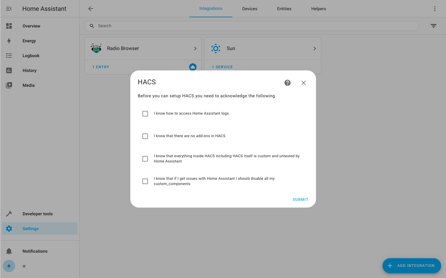 Now you can click “Submit” to complete the HACS configuration.