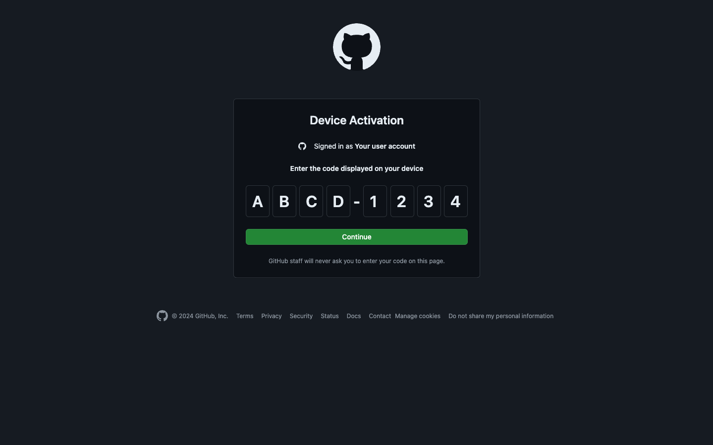 On the first screen, you are shown a device code. Copy it to your clipboard and then click https://github.com/login/device to continue setup.