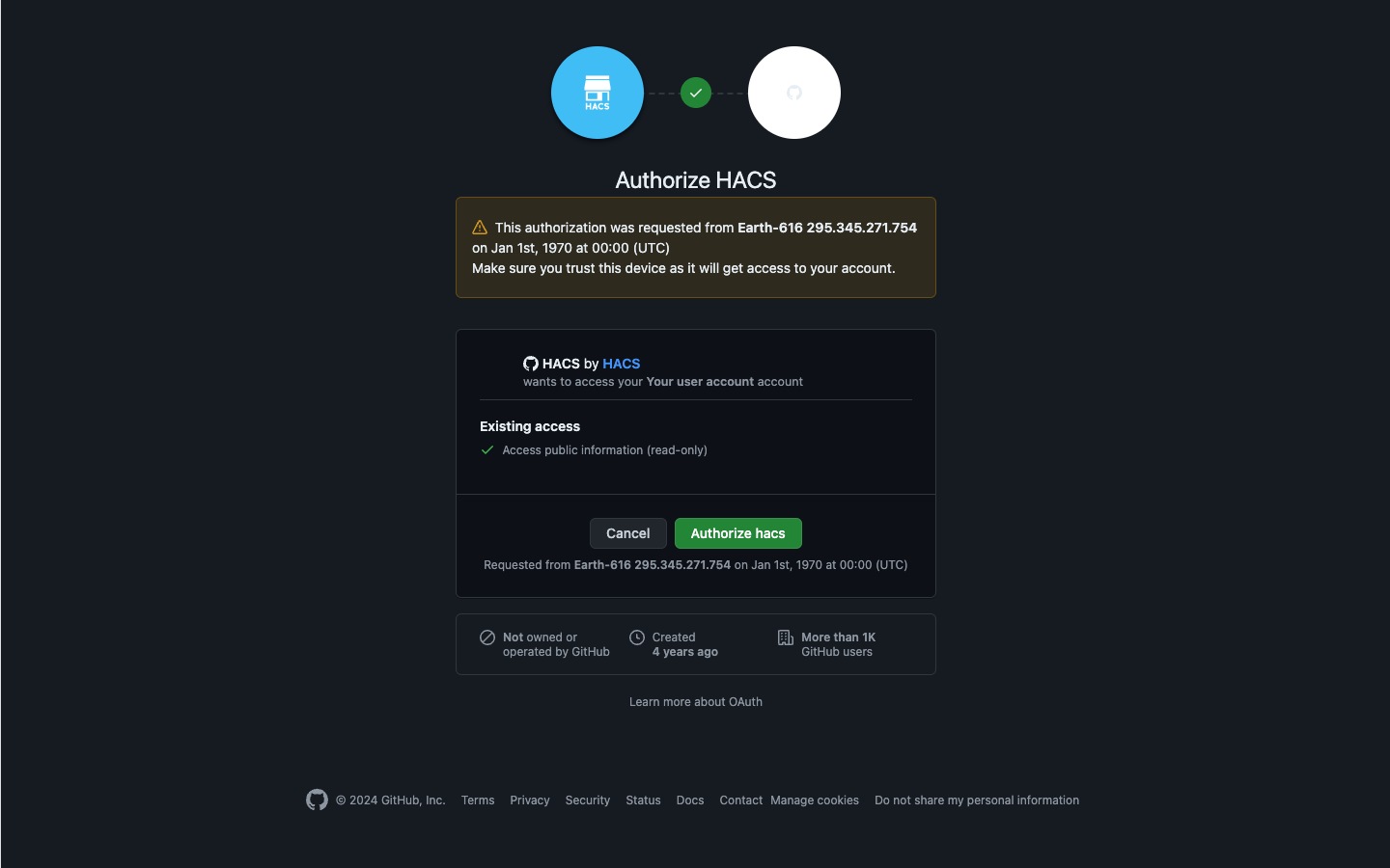- HACS uses the device OAuth flow to authenticate with the GitHub API.