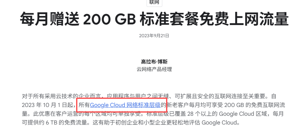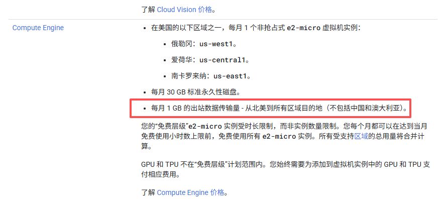 之前介绍了几个免费的云服务器,那其实海外三大云服务商(谷歌、亚马逊、微软)都是有自己的免费服务器,只是后面两个都是限时,不好玩,谷歌除了能试用三个月正价机器,还有个永久免费的小鸡,2核1g内存30g硬盘,200g流量/月,玩一玩还是可以的。谷歌云,顾名思义就是谷歌做的云服务器。现在谷歌云的试用是只有三个月,好像是300美元额度,买正价机器一下子就用完了,所以,不如玩免费服务器。本篇不涉及谷歌云注册以及试用那些,这玩意有谷歌账号的都能注册,没啥难度,而且我好几年前就注册过了,具体细节早就不记得,不知道的自行谷歌,就算是新账户还在试用中也不影响本文试用免费实例。主要是谷歌云的免费服务器,谷歌云给了对应地区的免费配额,俄勒冈、爱荷华、南卡罗来纳的e2-micro实例,2核cpu+1g内存+30g硬盘,带公网ipv4,每个月200g流量,这个流量是不限地区的,有人会说图片内不是写着“每月 1 GB出站流量吗”,是的,首先谷歌云是只计算出站流量,而非双向流量,其次图内的这个免费1g流量是“高级层级”,而非“标准层级”的流量,高级层级要比标准层级网络质量好一点,当然也仅限于好一点(虽然以前不是),而标准层级是全球200g流量。